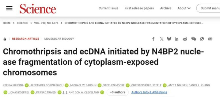 加州大学圣地亚哥分校的科学家刚刚找到了癌症快速演化和耐药性背后的关键推手。这个名为N4BP2的酶能够闯入被困在微核中的染色体,像分子剪刀一样将其切割成数十甚至上百个碎片,随后这些碎片以混乱的顺序重新拼接,制造出全新的基因组排列组合。